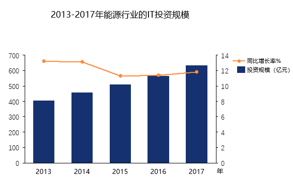 隨著信息技術(shù)的飛速發(fā)展,企業(yè)信息化水平不斷提升,尤其是石油石化這種大型能源行業(yè),由于企業(yè)規(guī)模大、業(yè)務(wù)覆蓋面廣、行業(yè)發(fā)展步伐加速,對信息化的投入力度也在不斷增加。數(shù)據(jù)顯示,2013 年能源行業(yè)的IT投資規(guī)模為 405 億元人民幣,比2012 年增長13.2%,2014年能源行業(yè)的 IT 投資規(guī)模為458億元人民幣,保持著穩(wěn)健的增長速度,2015 年能源行業(yè)的IT投資規(guī)模達(dá)到510億元,2016年568億元,2017年635億元。