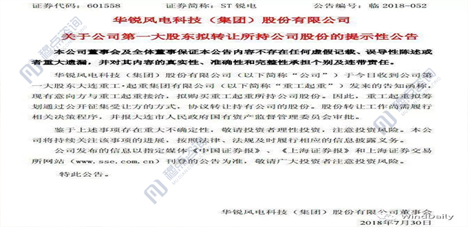 近日,一則“大連重工˙起重?cái)M轉(zhuǎn)讓華銳風(fēng)電股?.