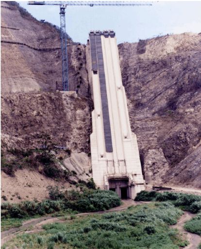 ③岸塔式進(jìn)水口(又稱壓力墻式進(jìn)水口):緊靠在岸坡上經(jīng)開挖、平整、護(hù)砌而成的進(jìn)水塔,結(jié)構(gòu)形式與塔式進(jìn)水口相同。根據(jù)巖坡的穩(wěn)定條件,塔可以直立,也可以斜依在岸坡上(又稱斜坡式進(jìn)水口),喇叭口,閘門槽都在山巖外面,啟閉機(jī)室與山巖之間不用架橋。其優(yōu)點(diǎn)是:穩(wěn)定性較塔式好,結(jié)構(gòu)簡單,施工、安裝方便,穩(wěn)定性好,工程量小不需要連接岸邊的橋梁;缺點(diǎn)是:關(guān)門時,閘門不易靠自重下降,需要另加閉門力?捎糜诎镀螺^為平整的中小型工程或只設(shè)檢修閘門的進(jìn)水口。適用于岸坡較陡,巖石堅固穩(wěn)定的情況。