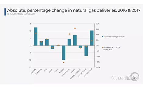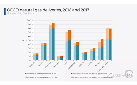 在經(jīng)合組織歐洲國家,最大的增長來自土耳其(+15.3%)、荷蘭(10.5%)和意大利(+6.0%),反映了其電力和供暖使用的增長。2017年在歐洲區(qū)域罕見的冬季極寒氣候造成了整個區(qū)域較高的天然氣需求。較差的降水和較低的風(fēng)速明顯降低了水電和風(fēng)電發(fā)電量,相應(yīng)就促進了天然氣的需求,特別是西班牙和葡萄牙,兩個國家天然氣輸送分別增長了8.7%和21.2%。