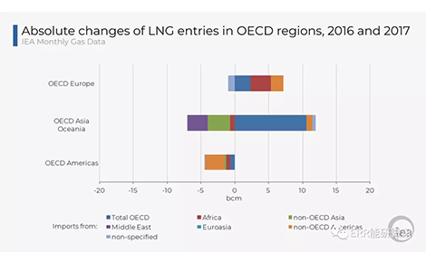 2017年經(jīng)合組織進口天然氣同比增長5.1%,增長量約1050億立方米。由于電力和供熱部門的高需求,歐洲區(qū)域天然氣的進口數(shù)量較高(增長6.8%),亞太區(qū)域增長2.4%,而美洲區(qū)域基本保持不變(-0.4%)。