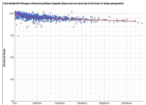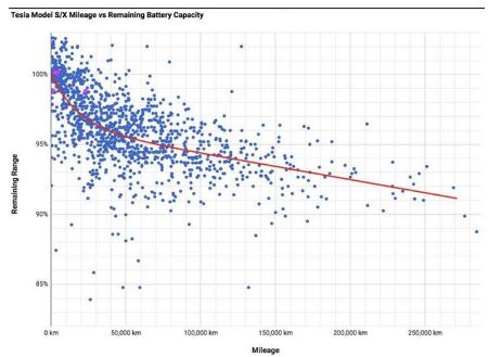 特斯拉論壇內(nèi)的一群車主正從全球350多輛特斯拉汽車處采集相關(guān)的數(shù)據(jù),并將其研究發(fā)現(xiàn)頻繁更新到谷歌的公共文件內(nèi)。該數(shù)據(jù)清楚地表明,在經(jīng)歷了5萬英里(約10萬公里)行駛里程后,大多數(shù)特斯拉車載蓄電池容量的衰減率將達到5%,隨著行駛里程數(shù)的增長,電池的容量將趨于平穩(wěn)狀態(tài),看起來似乎不太會再衰減5%。
