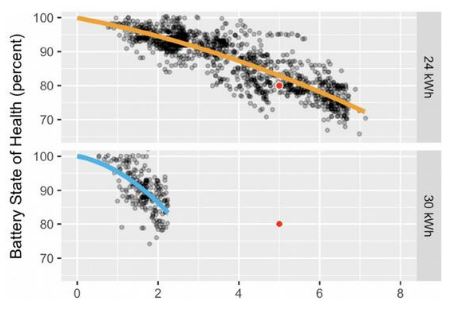 他(她)們將部分處于異常值(outlier)的蓄電池組剔除在外,然后將直流快充及每日的充電狀態(tài)等其他數(shù)據(jù)納入考量范圍,想找出電池衰減的原因及各因素間的關(guān)聯(lián)性。然而,目前還沒有跡象表明這類因素會對其數(shù)據(jù)造成重大影響。