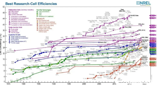 圖2.美國國家能源部可再生能源實驗室NREL太陽能電池效率表(2019)