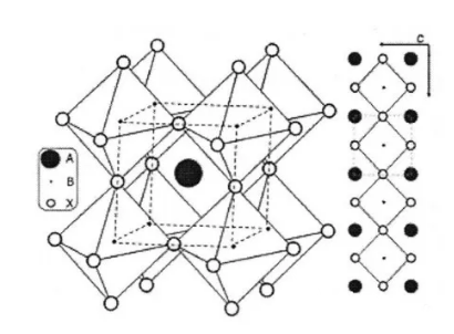 圖4.有機-無機雜化鈣鈦礦材料晶體結構圖,A=CH3NH3;B=Pb;X=I,Br,C1