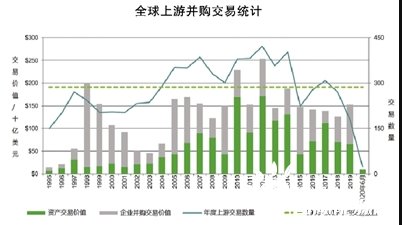 從1995年至今的25年中,布倫特油價(jià)有四次明顯暴跌。而資產(chǎn)交易和企業(yè)并購與油價(jià)的表現(xiàn)并不同步,上游資產(chǎn)交易與油價(jià)的關(guān)系比企業(yè)并購更密切。上游資產(chǎn)交易活動(dòng)的低點(diǎn)出現(xiàn)在油價(jià)達(dá)到低點(diǎn)之后的1-3個(gè)月,一旦油價(jià)從低點(diǎn)反彈30-50%的區(qū)間內(nèi),交易活動(dòng)往往就會(huì)反彈。