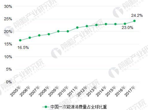 圖表6:2005-2017年中國大陸一次能源消費總量占全球比重變化(單位:%)