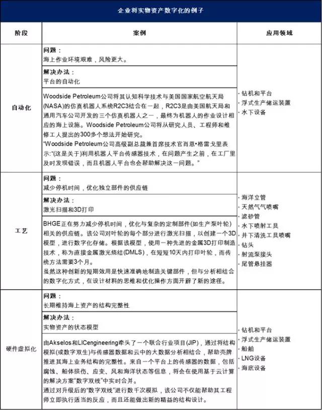 石油天然氣公司可以優(yōu)化它的實體作業(yè)環(huán)境,并在三個階段采用新的資本類型——增加領(lǐng)域內(nèi)機器人的使用,甚至超越它們典型的監(jiān)視和檢查的作用;制造進入市場周期時間較長的特定部件,并可以自定義設(shè)計;創(chuàng)建物理資產(chǎn)的狀態(tài)模型,或虛擬克隆(技術(shù)上稱為“數(shù)字雙線”),結(jié)合物理模型和數(shù)據(jù)驅(qū)動的來進行分析。