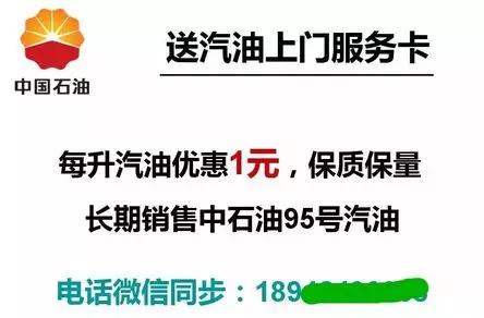 卡片上說(shuō)長(zhǎng)期銷(xiāo)售中國(guó)石油汽油,價(jià)格優(yōu)惠,送油上門(mén),以后加油不用跑加油站了,回家打個(gè)電話,讓送到家門(mén)口加就行了。那么問(wèn)題來(lái)了,中國(guó)石油是否真的開(kāi)展此類(lèi)業(yè)務(wù)了嗎?