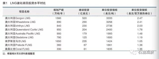 大型LNG項(xiàng)目裝置的建設(shè)基本采用模塊化設(shè)計(jì),可 以在管廊、工藝等環(huán)節(jié)嚴(yán)格控制建設(shè)成本。模塊化設(shè)計(jì)的 俄羅斯亞馬爾LNG項(xiàng)目位于北極圈內(nèi),自然環(huán)境惡劣, 缺乏社會(huì)依托,單套裝置能力為550萬(wàn)噸/年,單位建設(shè)投資1424美元/噸。澳大利亞惠特斯通(Wheatstone)項(xiàng)目設(shè)計(jì)規(guī)模890萬(wàn)噸/年,單位建設(shè)投資3258美元/噸;高庚(Gorgon)項(xiàng)目拖延多年,勞工糾紛,成本超支,單位建設(shè)投資達(dá)到3333美元/噸。對(duì)比亞馬爾項(xiàng)目與高庚項(xiàng)目,兩個(gè)項(xiàng)目液化規(guī)模相當(dāng),后者的建設(shè)投資水平高出150%。莫桑比克CoralFLNG項(xiàng)目液化船的生產(chǎn)規(guī)模330萬(wàn)噸/年,單位投資1853美元/噸(見(jiàn)表1)。