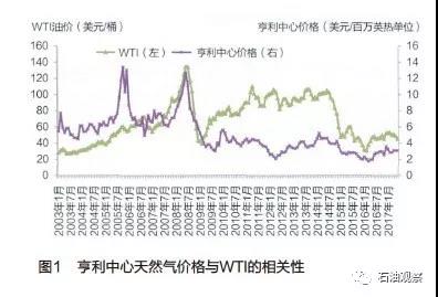 近年來(lái),亨利中心價(jià)格與WTI油價(jià)的關(guān)聯(lián)性較小, 尤其在2009年之后,兩者的價(jià)格相關(guān)性進(jìn)一步減弱(見(jiàn)圖1)。