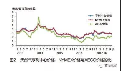 通過(guò)2013年1月-2017年10月的亨利中心和AECO天然氣價(jià)格、WTI和布倫特油價(jià)的對(duì)比發(fā)現(xiàn),AECO天然氣 價(jià)格略低于亨利中心價(jià)格和NYMEX價(jià)格,近年基本維持 在0.6美元/百萬(wàn)英熱單位上下的價(jià)差(見(jiàn)圖2)。