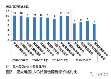 (3)價(jià)格公式掛靠類型多樣化。除了傳統(tǒng)做法,例如亞太采用掛靠JCC油價(jià)定價(jià)公式,北美出口LNG采用的和JCC油價(jià)混合定價(jià)公式,另外,歐洲市場(chǎng)開(kāi)始直接掛靠布倫特油價(jià),北美市場(chǎng)開(kāi)始直接掛靠亨利中心氣價(jià)或者同時(shí)簽訂兩種價(jià)格公式,交付時(shí)以價(jià)低者為準(zhǔn),即,LNG到岸價(jià)格=A×亨利中心價(jià)格+B,或者LNG到岸價(jià)格=C×JCC。原料氣價(jià)格開(kāi)始在LNG長(zhǎng)貿(mào)合同中發(fā)揮作用,資源地