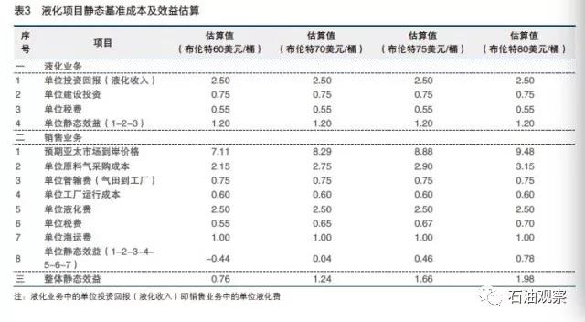 根據(jù)項(xiàng)目基準(zhǔn)成本和最低投資回報(bào)測(cè)算,如果未來(lái)油價(jià)無(wú)法達(dá)到70美元/桶以上,或者LNG到岸銷售價(jià)格無(wú)法達(dá)到11.5%以上的JCC油價(jià)掛靠系數(shù),那么此類液化項(xiàng)目不具備市場(chǎng)生存的空間,從而無(wú)法讓投資者做出相應(yīng)的投資決策(見(jiàn)表3)。