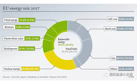 如果在可再生能源中不計(jì)水電,2017年歐盟風(fēng)電、生物質(zhì)和太陽能發(fā)電量(679TWh)在歷史上首次超過了煤電(669TWh)。