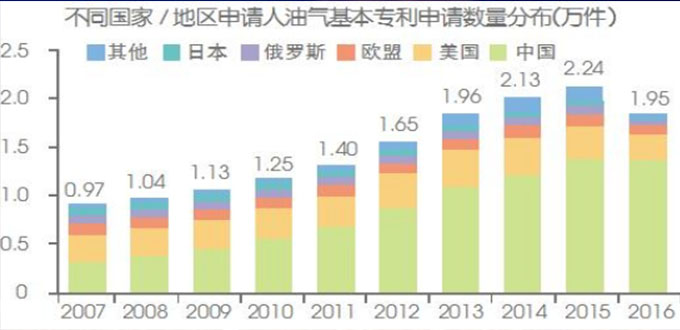 面對國際油價低位徘徊形勢,2015年全球在油氣領域共完成基本專利申請2.25萬件,比上年增長5.6%,但與2007~2014年間11.8%的年均增長速度相比,增速明顯降低。其中,中國機構和個人申請的專利量逐年增加,占全球油氣基本專利總量的比例從2007年的34.0%快速增加至2015年的64.3%。2016年的全球油氣專利申請統(tǒng)計數(shù)據(jù)尚未全部公開,但中國企事業(yè)單位及個人專利申請量已基本達到2015年申請總量,占全球油氣領域基本專利總量的比例預計將達到70%左右。美國機構和個人專利申請量占全球油氣基本專利總量的比例從2007年的31.8%降至2015年的16.4%,歐盟機構和個人專利申請量占全球油氣基本專利總量的比例從2007年的11.6%降至2015年的5.7%,日本機構和個人專利申請量占全球油氣基本專利總量的比例從2007年的8.9%降至2015年的2.2%。