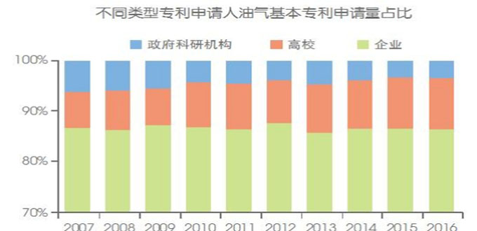 從非個人類型的專利申請人來看,企業(yè)依然是油氣技術開發(fā)的主體,占據(jù)油氣領域基本專利申請總量的85%左右。中國科學院等政府性科研機構在油氣領域的專利申請量增速遠遠落后于企業(yè)與高校,基本專利申請量占比從2007年的6.33%降至2015年的3.49%。高校專利申請則十分活躍,維持15%左右的年均增速,在全球油氣基本專利申請總量中的占比從2007年的6.99%增長到2015年的10.11%。究其原因,一方面是因為科研院所回歸科學研究領域(科學成果不能申請專利),僅在某些顛覆性、關鍵性技術領域進行“棋局式”專利布局;另一方面是因為高等院校,尤其是專業(yè)性高校,重視技術研發(fā)投入和合作,儲備大量靠近市場應用和推廣領域的專利,謀求通過技術轉(zhuǎn)移或?qū)@\營獲取收益。從技術領域來看,科研機構重視煉油領域?qū)@暾垼计浠緦@暾埩康?6.64%,高;緦@袩捰皖I域?qū)@急葹?5.32%,而企業(yè)基本專利中煉油領域?qū)@急葎t只有31.44%。企業(yè)對鉆井領域?qū)@暾埜鼮橹匾,占其基本專利申請總量?2.15%,政府性科研機構基本專利中鉆井領域?qū)@急葎t僅為16.21%。