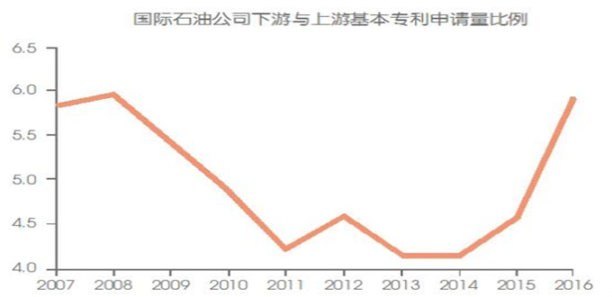 2014年國際油價“斷崖式”下跌以前,國際石油公司對油氣上游領域的關注程度高于下游領域,其下游與上游基本專利申請量比例從2007年的5.9逐步降至2014年的4.1。2014年開始的低油價促使國際石油公司調(diào)整技術開發(fā)重點,對下游煉化領域的重視程度明顯增強。受此影響,五大國際石油公司2015年的下游與上游基本專利申請量比例回升至4.6,從2016年已公開的專利數(shù)據(jù)看,又進一步上升至5.9。從煉油化工全部基本專利構成來看,煉油專利占下游專利總量的36.6%,化工專利占下游專利總量的78.5%,煉油與化工通用型專利占煉油化工專利總量的15.1%。