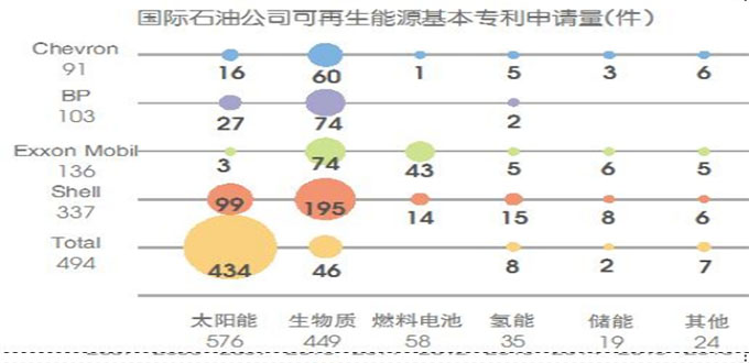 五大國際石油公司高度關注可再生能源技術的專利儲備,2007~2016年累計申請可再生能源相關基本專利1161件,占基本專利申請總量的9.12%。2010~2014年是國際石油公司進行可再生能源技術研發(fā)的黃金時期,基本專利申請量從之前的不足50件/年大幅提升至150件/年,2015年起進一步降為100件/年的水平。道達爾、BP及殼牌公司表現(xiàn)尤為搶眼,可再生能源基本專利占比均達到10%以上。道達爾、殼牌看好太陽能領域(尤其是光伏發(fā)電),共申請專利530件,但主要通過并購公司方式進行專利儲備,如Sunpower公司、日本昭和殼牌石油公司等。國際石油公司在生物質(zhì)領域均儲備大量專利,特別是纖維素乙醇、生物柴油等技術領域。殼牌、?松梨诘裙驹谌剂想姵、儲能及氫能領域也進行了一定的技術儲備。然而,與積極投資發(fā)展風力發(fā)電、地熱發(fā)電不同,國際石油公司在風能及地熱領域的專利儲備很少,均僅有5件專利。
