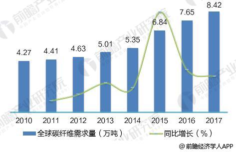 碳纖維以其優(yōu)異的性能被世界各個(gè)國(guó)家所重視,研究結(jié)果表明,碳纖維的強(qiáng)度、模量以及密度等方面相對(duì)金屬材料,其優(yōu)勢(shì)十分巨大,在國(guó)際上有著“黑色黃金”之稱。2010年以來(lái),全球碳纖維需求量逐年增加。2017年,全球碳纖維需求量達(dá)8.42萬(wàn)噸,同比增長(zhǎng)10.1%。