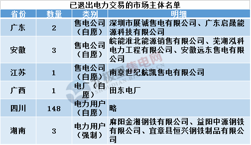 截至目前,全國已有3個省份的6家售電公司宣布退出電力市場,此外,還有廣西的1家電廠、四川、湖南的共計151家電力用戶退出。