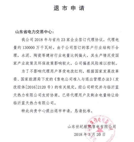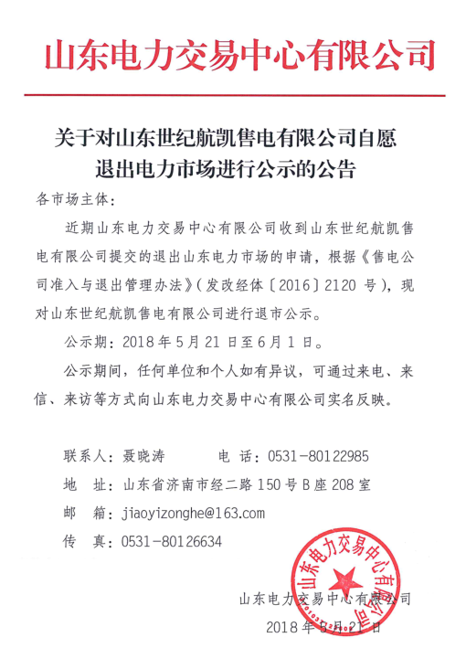 5月21日,山東電力交易中心發(fā)布了一則《關(guān)于對山東世紀航凱售電有限公司自愿退出電力市場進行公示的公告》,公示期為一個月,這是繼5月10日廣東發(fā)布首例售電公司退出市場的11天后,山東發(fā)布的首例售電公司退出市場公示。