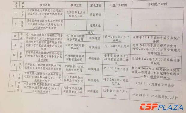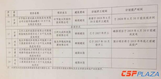3、通報中所列承諾繼續(xù)建設(shè)的示范項目投資企業(yè),須按照通報中明確的計劃開工時間和計劃投產(chǎn)時間,同時落實安全生產(chǎn)責(zé)任和工程質(zhì)量要求,確保示范項目建成投產(chǎn)。對于未按通報明確時限開工或投運的項目投資企業(yè),將視情節(jié)輕重予以通報或限制參與后續(xù)太陽能熱發(fā)電示范項目建設(shè)。(這意味著,此前各示范項目業(yè)主方向政府承諾的計劃開工時間和計劃投產(chǎn)時間,將與懲罰機制相掛鉤。各示范項目的承諾情況請見附表。)