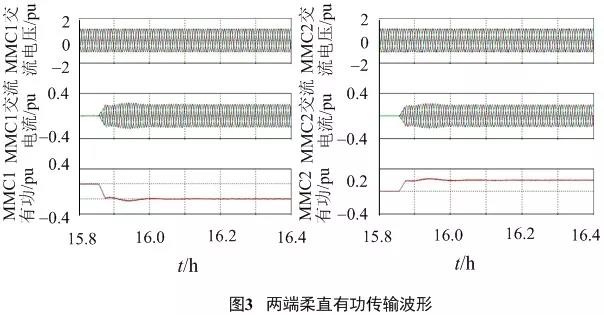 針對電力盈虧優(yōu)先考慮儲能系統(tǒng)平衡的局限性問題,將柔性直流互聯(lián)應(yīng)用于交直流混合配電網(wǎng)工程,可以在換流站一端出現(xiàn)功率缺口時由直流母線及時提供功率供給。例如微網(wǎng)有功功率有2.53 MW的功率缺口,相對于柔直容量的0.158 pu,通過柔性直流互聯(lián)從外部電網(wǎng)受電時功率傳輸,兩站的運行情況如圖3所示。