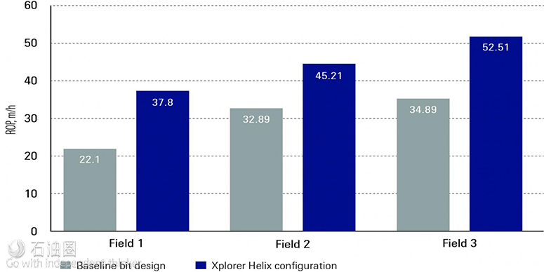 為了應(yīng)對(duì)難鉆地層并獲得較高的機(jī)械鉆速,開發(fā)商和Smith Bits決定選用6-1/8in的高級(jí)螺旋碳化鎢鑲齒結(jié)構(gòu)牙輪鉆頭。相比常規(guī)鉆頭,新型鉆頭的機(jī)械鉆速在三個(gè)油田中分別提高了70%、37.5%和51.8%,大大降低鉆井時(shí)間。