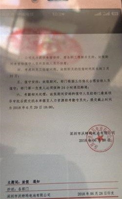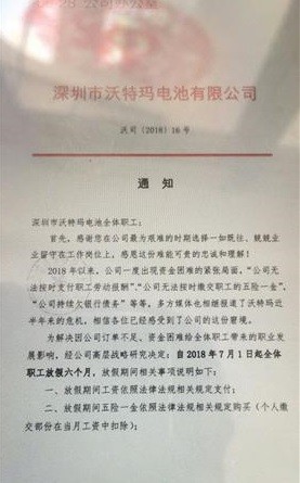 6月28日上午,堅(jiān)瑞沃能子公司深圳市沃特瑪電池有限公司員工爆出收到放假通知公告。公告中稱,為解決公司因訂單不足,資金困難給全體員工帶來(lái)的職業(yè)發(fā)展影響,經(jīng)公司高層戰(zhàn)略研究決定,自2018年7月1日起,全體職工放假六個(gè)月。