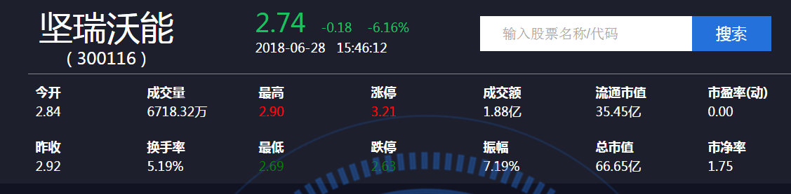 截至2018年06月28日下午3點(diǎn)收盤,堅(jiān)瑞沃能股票出現(xiàn)異動(dòng),股價(jià)大幅下跌6.16%。截至發(fā)稿,該股報(bào)2.74元/股,成交量6718.32萬(wàn)手,成交額1.88億元,換手率5.19%,振幅7.19%,總市值66.65億元。
