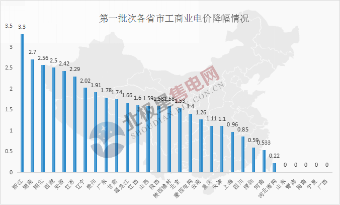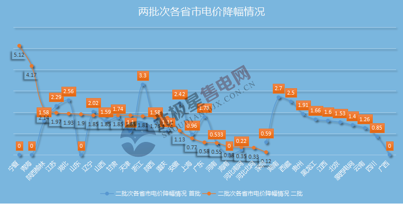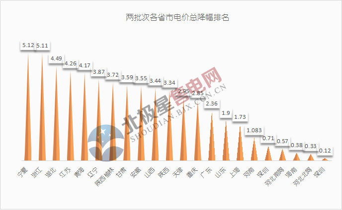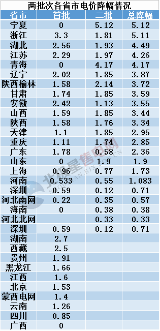 從兩批次降電價(jià)總體情況來看,寧夏以5.12分的最大降幅位列全國(guó)首位,其次為浙江,在首批降電價(jià)方案中,浙江宣布降低省一般工商業(yè)及其他用電目錄電價(jià)和輸配電價(jià)每千瓦時(shí)3.3分(含稅),而在第二批降電價(jià)方案里,浙江再次將一般工商業(yè)及其他用電目錄電價(jià)和輸配電價(jià)降1.81分/千瓦時(shí),兩批次降幅合計(jì)在5.11分,位列降幅榜第二位,也成為目前降幅在5分以上的兩省份之一。排在第三位的湖北省在第一批降電價(jià)方案里,湖北省一般工商業(yè)及其他用電目錄電價(jià)及輸配電價(jià)同降0.0256元/千瓦時(shí),第二批湖北降低一般工商業(yè)及其他用電目錄電價(jià)、輸配電價(jià)0.0193元/千瓦時(shí),兩批次降幅達(dá)到4.49分。