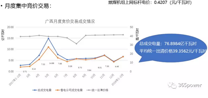 月度集中競(jìng)價(jià)交易中售電公司參與程度極高,由于政策放開,2017年5月35千伏以上電壓等級(jí)用戶全面放開,5月集中競(jìng)價(jià)交易的成交電量增加,總體來看廣西月度集中競(jìng)價(jià)交易的電量及電價(jià)比較穩(wěn)定,電力體制改革穩(wěn)步開展。