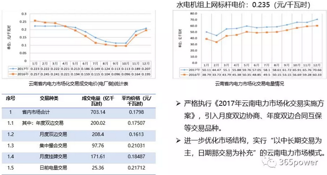 2017年,云南省內(nèi)市場(chǎng)共成交電量703.14億千瓦時(shí),其中年度、月度、日前交易電量比例為28%、69%、3%,“以中長(zhǎng)期交易為主,日期那交易為補(bǔ)充”的市場(chǎng)模式愈加成熟。全年電力市場(chǎng)整體呈現(xiàn)“電量穩(wěn)步增長(zhǎng)”狀態(tài),由于云南以水力發(fā)電為主,受汛期影響5-10月份電價(jià)逐步降低,汛期結(jié)束電價(jià)回歸正常。總體來看,電力市場(chǎng)進(jìn)入良好的可持續(xù)發(fā)展?fàn)顟B(tài)。