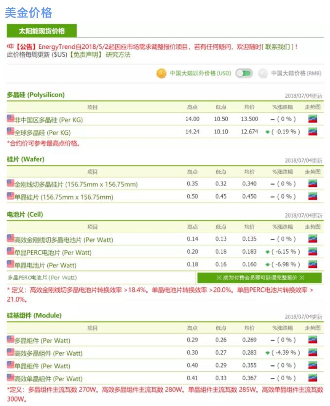 本周組件市場趨勢與上周類似,一般多晶組件的成交價大多可站上RMB 2/W,整體多晶組件的成交價則大致在RMB2.0~2.35/W區(qū)間。單晶組件價格則因上游電池片降價而跟著補跌,目前一般單晶組件價位下滑至RMB 2.25~2.35/W,高效單晶跌幅更深,到了RMB2.35~2.50/W。海外市場的成交價變化不大,可能是因海外市場仍以交付既有訂單有關(guān)。