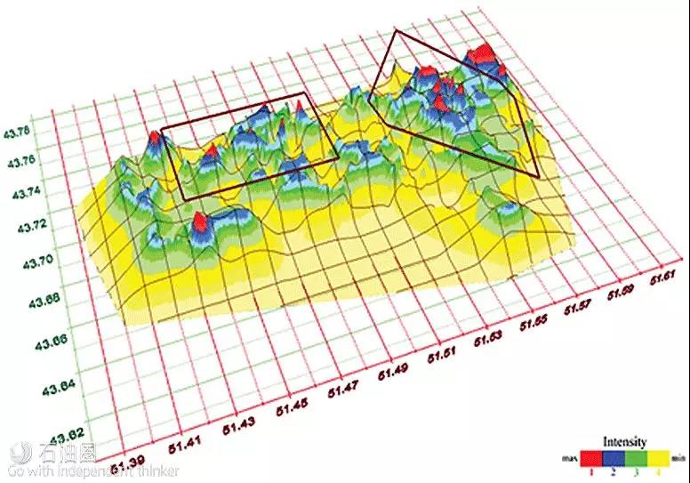 為了方便后續(xù)操作,需要在所識(shí)別的紅色和藍(lán)色異常區(qū)內(nèi)確定井位。研究人員根據(jù)獨(dú)立的地球動(dòng)力學(xué)模型分析、地震數(shù)據(jù)和DDT勘查結(jié)果,判斷高強(qiáng)度異常區(qū)與高度斷裂的局部區(qū)域?qū)?yīng)。該勘查技術(shù)不僅可識(shí)別現(xiàn)有的區(qū)域和構(gòu)造,還可精確顯示含油氣區(qū)域和構(gòu)造,這比其他勘查方法更優(yōu)越。