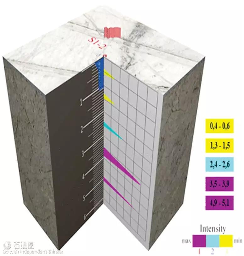 2017年,在上述地點(diǎn)完成了No.42井,完鉆井深3962 m。期間進(jìn)行了電測(cè),數(shù)據(jù)顯示,第1個(gè)明顯的產(chǎn)氣層位于2420 m,這與煤層有關(guān);油層位于3450和3900 m處。這些數(shù)據(jù)與基于第二階段勘查數(shù)據(jù)和分析的三維區(qū)塊圖中顯示的深度相符。作業(yè)人員挑揀出了各地層最具代表性的巖屑,并繪制在了巖性測(cè)井曲線上,如圖6。