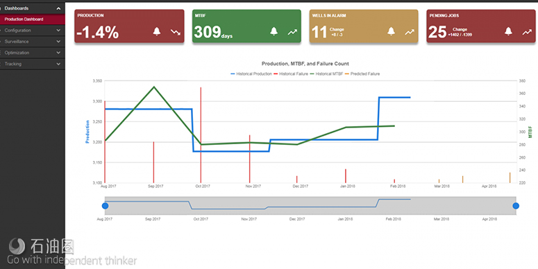 為了在更長的時間范圍內(nèi)確保資產(chǎn)的優(yōu)化與可靠性,該平臺的預測分析功能可以主動識別出較小的性能問題,防止其逐漸發(fā)展為更嚴重、更昂貴的問題。該功能將現(xiàn)場數(shù)據(jù)與高級分析工具相結(jié)合,以評估每口井的性能。