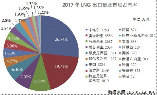 目前,全球LNG生產(chǎn)能力快速增長,已投產(chǎn)的LNG液化項(xiàng)目共43個(gè),分布在19個(gè)國家,液化能力合計(jì)為2.9億噸/年;在建項(xiàng)目共19個(gè),液化能力合計(jì)為1.38億噸/年,分布在澳大利亞、美國、俄羅斯、印度尼西亞和馬來西亞;規(guī)劃項(xiàng)目共29個(gè),液化能力合計(jì)為2.28億噸/年。