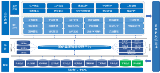 從2017年年初至今,在集團(tuán)領(lǐng)導(dǎo)關(guān)懷推動(dòng)下、能源部、信息技術(shù)部以及投管公司統(tǒng)一組織協(xié)調(diào)以及電廠(chǎng)全力配合下,經(jīng)過(guò)近一年多建設(shè),目前智慧能源平臺(tái)已基本建設(shè)完成,建設(shè)范圍覆蓋集團(tuán)能源部、揚(yáng)電/靖電等14家控股電廠(chǎng)35臺(tái)機(jī)組,以及參股電廠(chǎng)數(shù)據(jù)管理。建設(shè)內(nèi)容覆蓋能源部計(jì)劃統(tǒng)計(jì)、生產(chǎn)監(jiān)視與調(diào)度、新建/改擴(kuò)建工程項(xiàng)目管理、物資/燃料集中采購(gòu)、電子商務(wù)、電力營(yíng)銷(xiāo)、輔助決策等,以及電廠(chǎng)安全管理、運(yùn)行管理、設(shè)備管理、檢修管理、物資管理、預(yù)算管理、指標(biāo)管理、燃料管理、技術(shù)監(jiān)督、班組管理、合同管理、智能巡點(diǎn)檢、移動(dòng)應(yīng)用等業(yè)務(wù),基本覆蓋控股火電、抽蓄電站、燃機(jī)生產(chǎn)經(jīng)營(yíng)大部分業(yè)務(wù),并通過(guò)業(yè)務(wù)、數(shù)據(jù)集成,實(shí)現(xiàn)MIS系統(tǒng)與ERP SAP系統(tǒng)無(wú)縫集成,打通各電廠(chǎng)全廠(chǎng)數(shù)據(jù)流、信息流、資金流。