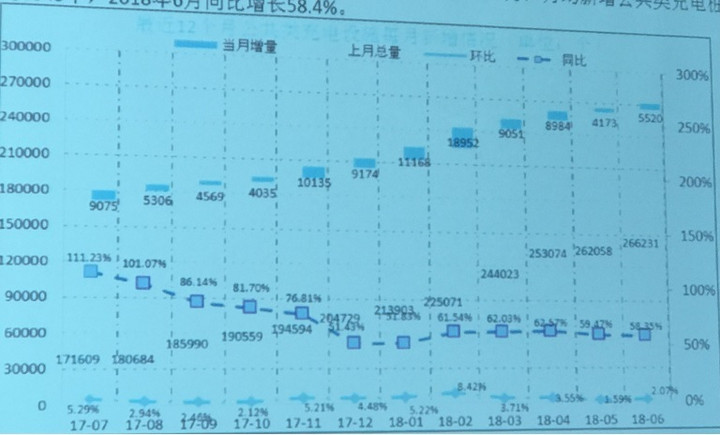2018年6月較2018年5月新增公共類充電樁5520個(gè)。從2017年7月到2018年6月,月均新增公共類充電樁約8345個(gè),2018年6月同比增長58.4%。今年上半年,新增部分的公共充電樁(含專用)同比增長90.6%,其中符合2015版國標(biāo)的占比約90%,公交、出租等專用車輛的電量增長呈穩(wěn)定上升趨勢(shì)。