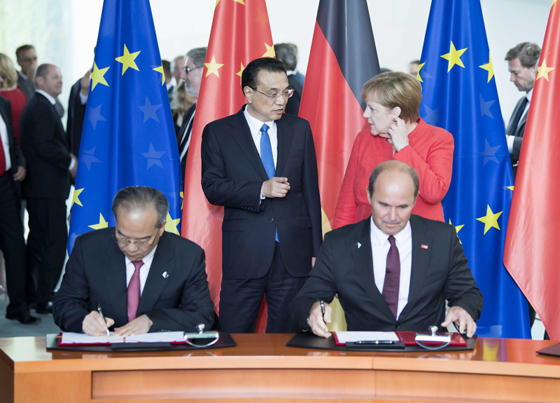 這一幕場(chǎng)景發(fā)生在當(dāng)?shù)貢r(shí)間7月9日下午,李克強(qiáng)與默克爾共同出席的簽字儀式上。在兩國(guó)總理共同見(jiàn)證下,中德雙方共簽署了22項(xiàng)雙邊合作文件,涉及農(nóng)業(yè)、教育、青年、衛(wèi)生、化工、通信、汽車(chē)、自動(dòng)駕駛等多個(gè)領(lǐng)域。