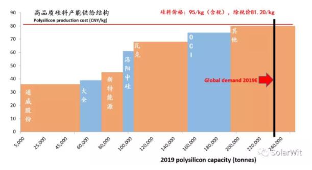 1、海外一直以來(lái)是供應(yīng)高品質(zhì)硅料的主力軍,韓國(guó)OCI和德國(guó)瓦克每年要向國(guó)內(nèi)供應(yīng)10萬(wàn)噸的高品質(zhì)硅料。國(guó)內(nèi)可以供應(yīng)高品質(zhì)硅料的企業(yè)只有4家,合計(jì)供應(yīng)能力僅為7萬(wàn)噸?紤]了關(guān)稅、雙反稅和增值稅以后,95元就是韓國(guó)OCI的現(xiàn)金成本的位置,所以對(duì)于高品質(zhì)硅料95元就是底部,因?yàn)橐坏┑陀诖藘r(jià)格,就會(huì)有高達(dá)10萬(wàn)噸的高品質(zhì)的產(chǎn)能退出。