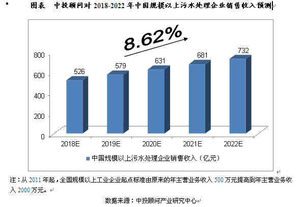 2016年,我國(guó)規(guī)模以上污水處理企業(yè)銷售收入達(dá)到了442.78億元,相比上年增長(zhǎng)4.52%。我們預(yù)計(jì),2018年我國(guó)規(guī)模以上污水處理企業(yè)銷售收入將達(dá)到526億元,未來(lái)五年(2018-2022)年均復(fù)合增長(zhǎng)率約為8.62%,2022年將達(dá)到732億元。