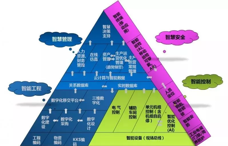 中國能建華北院設(shè)計(jì)的智慧電廠整體架構(gòu),采用金字塔形,涵蓋了電廠從建設(shè)到運(yùn)維的整個(gè)過程,是全生命周期的智慧電廠解決方案。智能工程和智能控制是智慧電廠的基礎(chǔ),智慧安全是重要特征,智慧管理則真正打通了各系統(tǒng)之間的信息壁壘,體現(xiàn)了智慧電廠的核心價(jià)值。