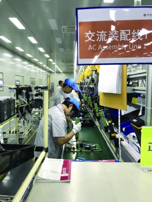 左圖為各種新能源汽車充電設備。右為生產(chǎn)車間 劉國慶攝