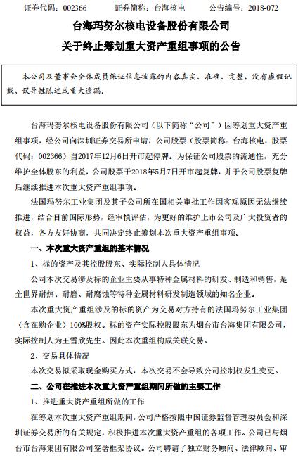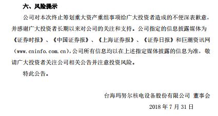臺海核電:終止籌劃重大資產(chǎn)重組