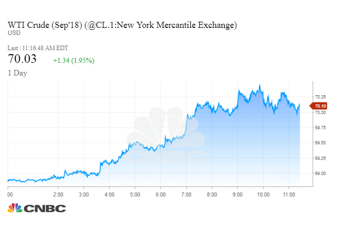 The contract to deliver international benchmark Brent crude for September was up 83 cents, or 1.1 percent, at $75.12 a barrel by 2:08 p.m. ET. The September contract expires on Tuesday. Trading was heavier for the October contract, which is up 97 cents, or 1.3 percent, at $75.73.