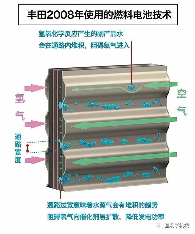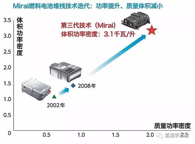 豐田Mirai搭載的燃料電池堆棧是由370片薄片燃料電池組成的,因此被稱為“堆!保还部梢暂敵114千瓦的發(fā)電功率。此前我們也分析了大眾集團(tuán)的燃料電池技術(shù),結(jié)構(gòu)基本類似。豐田的燃料電池堆棧經(jīng)歷了十幾年的技術(shù)優(yōu)化,形成了自己的特色結(jié)構(gòu),比如3D立體微流道技術(shù),通過更好地排出副產(chǎn)物水,讓更多空氣流入,有效改善了發(fā)電效率。所以整個堆棧的發(fā)電效率達(dá)到了世界先進(jìn)水平,達(dá)到了3.1千瓦/升,比2008年豐田的技術(shù)整整提升了2.2倍。