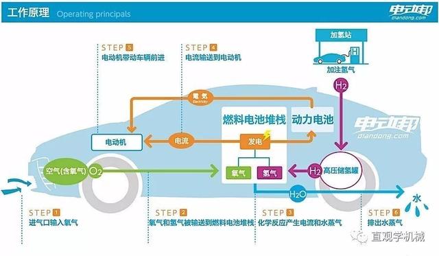 Mirai的工作原理,通過電解水制氫,再把氫氣加入車內(nèi)發(fā)生化學(xué)反應(yīng)驅(qū)動電機(jī)為車提供動力。